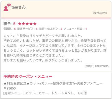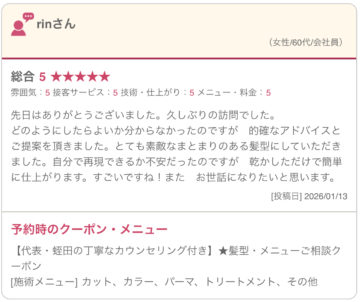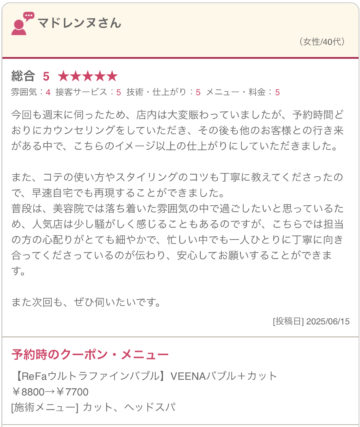 初めてお伺いしましたが、事前のご確認も細やかで、希望を汲み取っていただき、イメージ以上ですごく満足しています。全体のシルエットもちょうどよく、セットがしやすくて日々ちょっと気分があがります。落ち着いた時間を過ごすことができました。