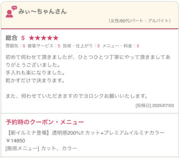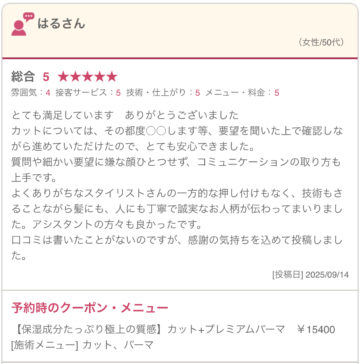 普段は、美容院では落ち着いた雰囲気の中で過ごしたいと思っているため、人気店は少し騒がしく感じることもあるのですが、こちらでは担当の方の心配りがとても細やかで、忙しい中でも一人ひとりに丁寧に向き合ってくださっているのが伝わり、安心してお願いすることができます。また次回も、ぜひ伺いたいです。