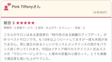 こちらのサロンはある美容家の「時代性のある綺麗のアップデート」が叶うベストサロンです。もう5年以上リピートしてますが一度も失敗がありません。常に進化のあるトレンドセンスとメンテナンスの両方をバランス良く作ってくれます。今回はイタリア帰りのスタイリスト氏おススメの「マロンベージュカラー」と厚めの前髪の小顔カット。とても素敵で満足度も高い仕上がりでした。
