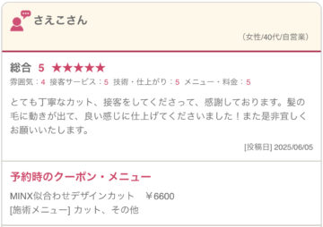 カットと接客に関しまして、さえこ様にご満足して頂けたようで大変嬉しく思います。