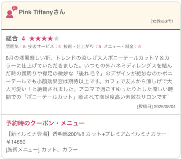 8月の残暑厳しい折、トレンドの涼しげ大人ポニーテールカット?&カラーに仕上げていただきました。いつもの外ハネミディレングスを結んだ時の顔周りや襟足の微妙な「後れ毛?」のデザインが絶妙なのかポニーテールでも小顔効果翌は期待以上です。カフェで友人から涼しげで大人可愛い!と絶賛されました。アロマで過ごすゆったりとした涼しい時間での「ポニーテールカット」癒されて満足度高い素敵なサロンです