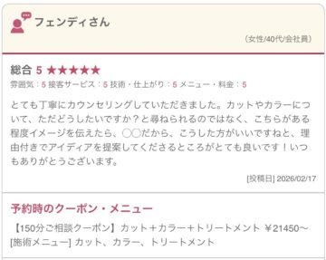 カウンセリングに関しまして、フェンディ様にご満足していただき大変嬉しく思います。